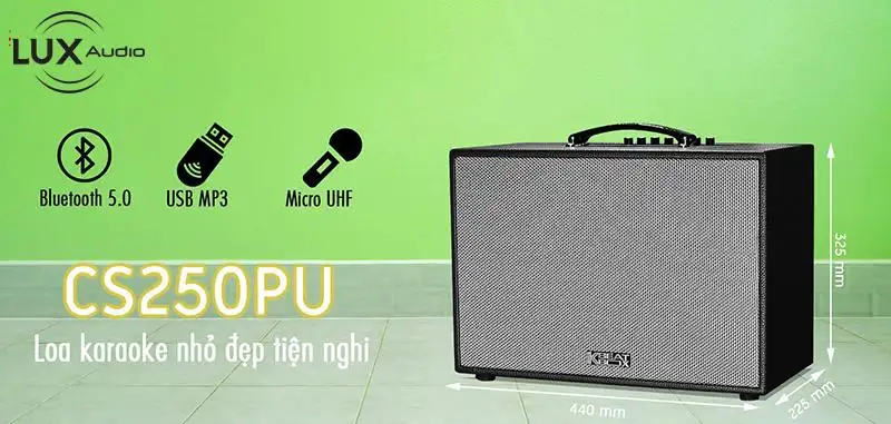 Hệ thống loa bao gồm 2 loa Bass 2,5 tấc (25cm) và loa Treble. 2 Micro UHF vỏ nhôm sang trọng – DSP nâng giọng hát nhẹ hơi, hút âm cực tốt. Công suất âm thanh PMPO 300W (max). Công nghệ Bluetooth 5.0 cho phép dò tìm thiết bị và kết nối nhanh hơn. Pin Lithium 33Wh phù hợp hành lý ký gửi (Tiêu chuẩn hành lý ký gửi cho pin Lithium của các hãng hàng không dưới 100Wh). Thiết kế mặt điều khiển ngay trên mặt máy, dễ dàng điều chỉnh âm lượng micro và âm lượng nhạc.