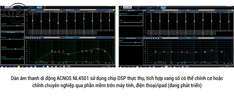 Dàn âm thanh di động ACNOS NL4501 sử dụng chip DSP thực thụ, Tích hợp vang số cho phép chỉnh cơ (Phần mềm chỉnh âm thanh chuyên nghiệp dùng cho khách hàng am hiểu về âm thanh hoặc có yêu cầu khắc khe về âm sắc sẽ ra mắt trên máy tính và thiết bị di động trong thời gian sắp tới). Máy khắc phục nhiễu nền tốt ngay cả khi mở mic. Nút nguồn ngay trên mặt máy giúp dễ dàng thao tác và tính năng tắt mềm không tiêu thụ điện.