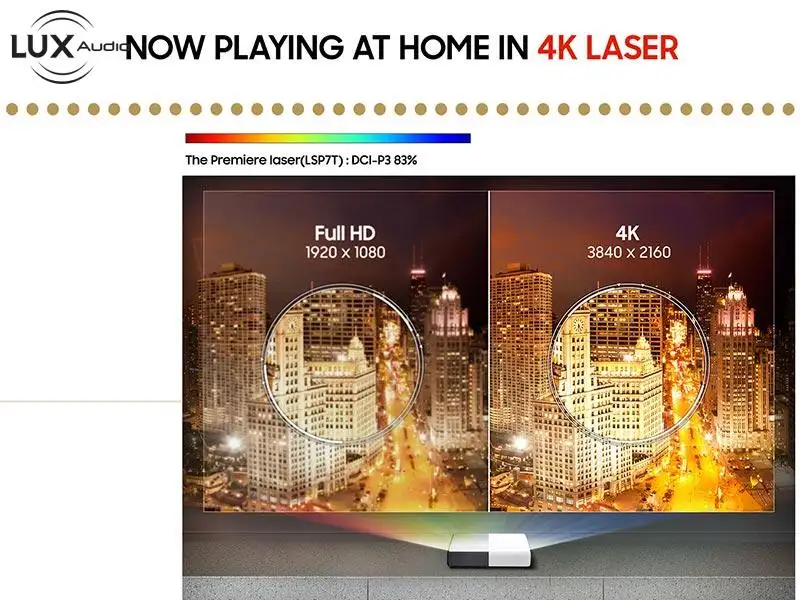 Với độ nét 4K UHD độ sáng, độ sáng 2400 lumen, và khả năng phóng đại hình ảnh lên 120 inch ở khoảng cách 415mm, Máy chiếu 4k siêu gần Samsung LSP7T ( hay còn gọi là Máy Chiếu Samsung The Premiere LSP7T) đang rất được ưa chuộng tại Việt Nam. Sản phẩm hiện được bán chính hãng với nhiều ưu đãi tại Lux Audio.