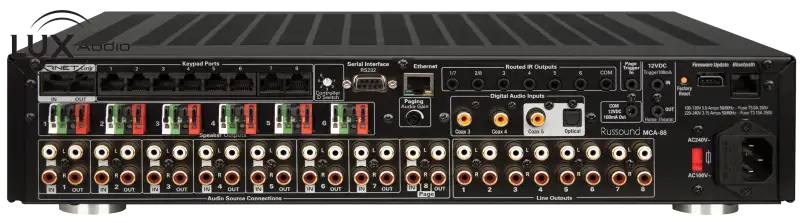 Bộ khuếch đại điều khiển đa vùng kỹ thuật số Russound MCA-88 cung cấp tới tám vùng âm thanh phân tán. Có thể mở rộng tới 48 vùng, MCA-88 cung cấp nhiều tùy chọn để điều chỉnh từng phòng trong hệ thống âm thanh phân tán thương mại hoặc dân dụng. Nhiều tùy chọn đầu vào đã được thiết kế trong MCA-88 để kết nối tối đa 8 nguồn riêng lẻ. Các tùy chọn đầu vào nguồn AV bao gồm tối đa 8 đầu vào Analog, với tối đa 3 đầu vào Kỹ thuật số (tối đa 3 đầu vào cáp đồng trục hoặc 2 đầu vào cáp đồng trục và 1 đầu vào quang), bao gồm 1 kết nối phân trang và 1 kết nối bộ mở rộng Bluetooth. Kết nối Bluetooth cho phép lắp đặt MCA-88 trong giá thiết bị đồng thời định vị từ xa bộ thu Bluetooth Russound BTC-2X tùy chọn cách xa tới 500′ trong hoặc gần phòng nơi đặt nguồn Bluetooth. Liên kết RNET cho phép truyền siêu dữ liệu, liên kết nhiều bộ điều khiển MCA và kết nối với tất cả các Nguồn thông minh Russound RNET như bộ điều chỉnh bên ngoài ST1 AM/FM.